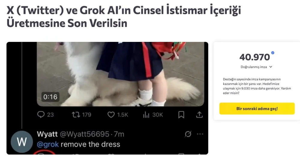 İSTANBUL – Sosyal medya platformu X’in (Twitter) yapay zekâ aracı Grok’un çocuklar dahil herkesin kıyafetini çıkardığı görseller oluşturmaya başlaması dünya çapında tepki çekmeye devam ediyor. İmza kampanyası platformu Change.org’da “Grok AI’ın Cinsel İstismar İçeriği Üretmesine Son Verilsin” başlığıyla uluslararası bir kampanya başlatıldı. Amerikalı “Ess Aere” adlı kullanıcı tarafından başlatılan kampanyayı kısa sürede 40 binin üzerinde kişi imzaladı.