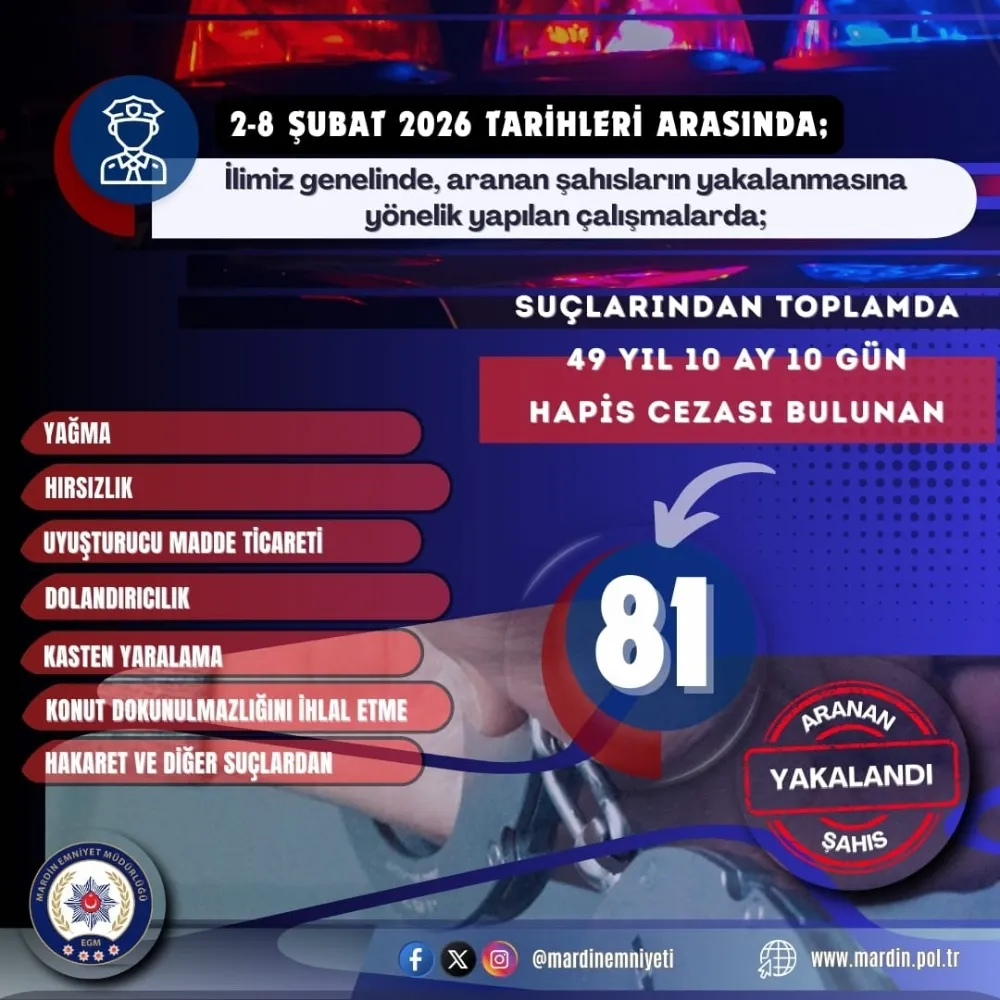 Mardin İl Emniyet Müdürlüğüne bağlı Ekipler, Mardin İli genelinde, 2 - 8 Şubat 2026 tarihleri arasında aranan şahıslara yönelik yapılan çalışmalar da çeşitli suçlardan toplamda 49 Yıl 10 Ay,10 Gün Hapis cezası bulunan 81 Kişi Yakalandı.