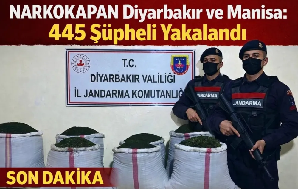 İçişleri Bakanı Ali Yerlikaya, "Bugün sabah Jandarmamız tarafından Diyarbakır ve Manisa’da, uyuşturucu madde satıcılarına yönelik düzenlediğimiz “NARKOKAPAN Diyarbakır ve Manisa” operasyonlarında 445 şüpheliyi yakalandığını duyurdu.