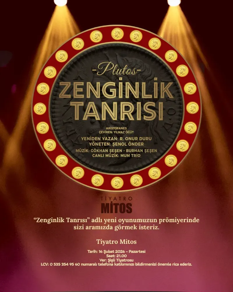 R. Onur Duru’nun yeniden yazdığı, Şenol Önder’in yönettiği Zenginlik Tanrısı; eşitlik, güç, para ve insan doğası arasındaki kırılgan dengeyi müzik, dans ve mizah eşliğinde sahneye taşıyor. Zenginlik Tanrısı Plutos’un “herkese eşit pay” vaadiyle başlattığı düzen, insanın parayla kurduğu ilişki üzerinden hızla çözülürken, seyirciyi hem kahkahaya hem de yüzleşmeye davet ediyor.