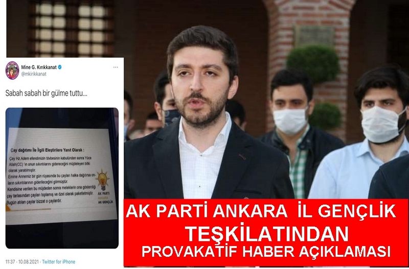 İl Gençlik Kolları Başkanı Burak Yıldız'ın atmış olduğu twit ile ilgili görselin kendilerine ait olmadığını belirterek; Gazeteci Mine Kırıkkanat'a araştırma yapmadan her konuya atlamasını alaycı bir paylaşımla adeta dalga geçti.