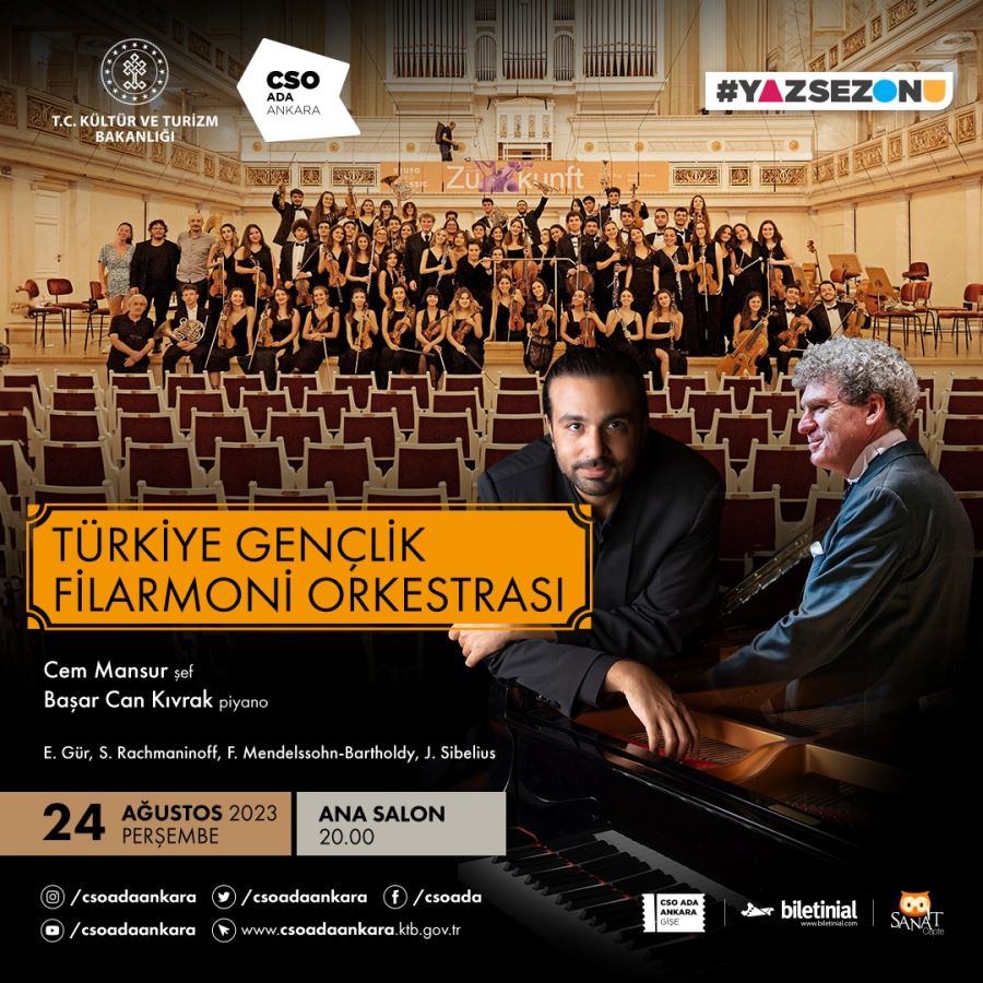 Türkiye’nin ilk gençlik filarmoni orkestrası olan Türkiye Gençlik Filarmoni Orkestrası, 24 Ağustos tarihinde CSO Ada Ankara’da müzikseverlerle buluşuyor. Konserde, genç besteci Ege Gür’ün Tugfo’nun siparişi üzerine bestelediği Görünmez Olanın İmgesi (Depremzedeler Anısına), bu yıl 150. doğum yılı kutlanan Rachmaninoff’un Piyano Konçertosu No. 2, Mendelssohn-Bartholdy’nin Bir Yaz Gecesi Rüyası, sahne müziği ve Sibelius’un Finlandia eserleri icra edilecek. Konserin solisti ise piyanist Başar Can Kıvrak olacak.