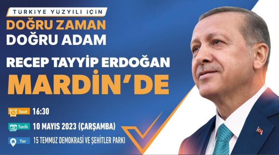 Cumhurbaşkanı ve Ak Parti Genel Başkanı Recep Tayyip Erdoğan, yarın Partisi tarafından saat 16.30'da Mardin 15 Temmuz Demokrasi ve Şehitler Parkında düzenleyeceği Miting'te partisinin Mardin Milletvekili adayları için oy isteyecek.
