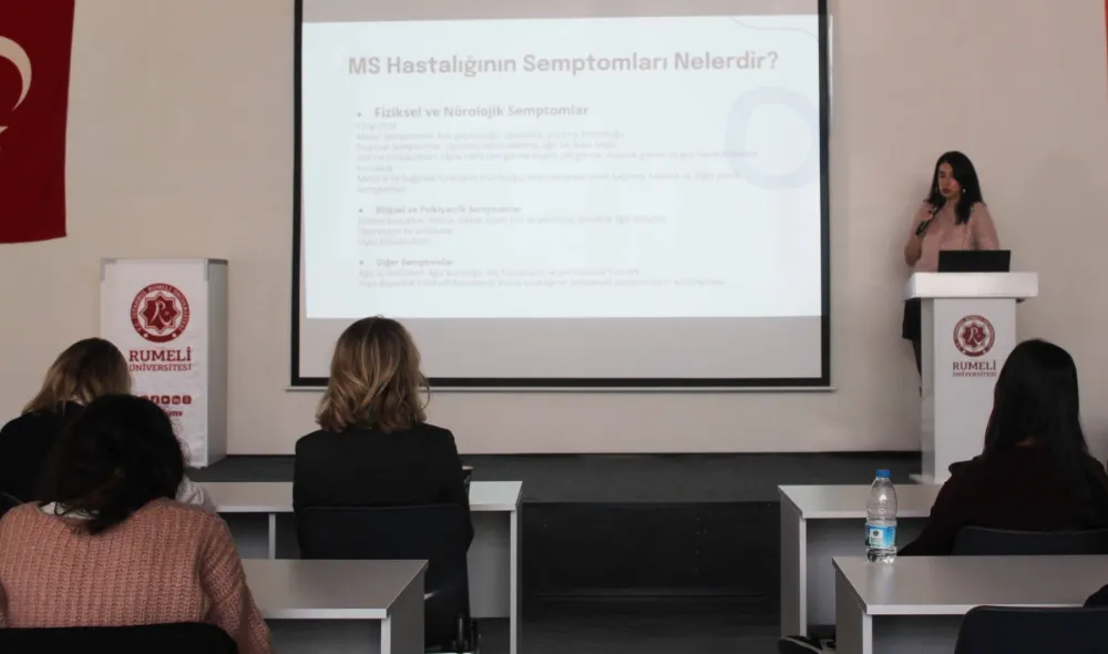Etkinlikte, Multiple Skleroz (MS) hastalığında beslenmenin rolü ve sağlıklı yaşam alışkanlıklarının hastalık süreci üzerindeki etkileri ele alındı. Kronik bir sinir sistemi hastalığı olan MS’in tedavisinde genellikle ilaçların ön planda olduğunu belirten Arş. Gör. Sanem Güven, doğru beslenmenin ve yaşam tarzı düzenlemelerinin tedaviye güçlü bir destek sağladığını vurguladı.