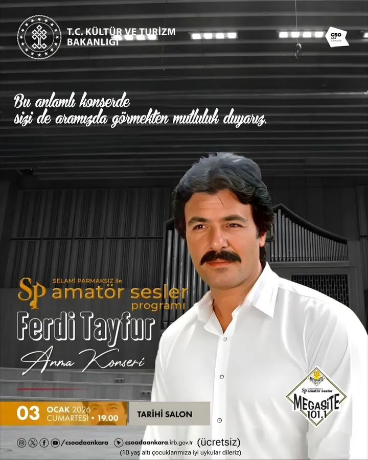 3 Ocak 2026 Cumartesi günü saat 19.00’da CSO Ada Ankara Tarihi Salon’da gerçekleştirilecek Selami Parmaksız’ın sunumu ve yönetimiyle hazırlanan Türk müziğinin unutulmaz isimlerinden Ferdi Tayfur’un eserlerinin seslendirileceği anma konseri, müzikseverleri bir araya getirecek ve sanatçının hafızalarda yer eden şarkıları seslendirilecek.
