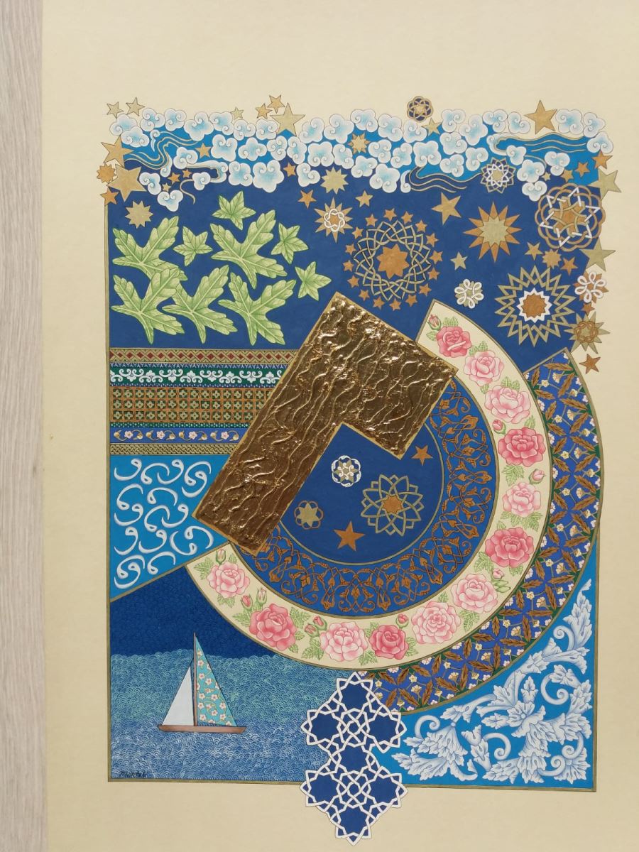 İstanbul’un deniz mavisi ile dolu olan sanatçının içine orman yeşilinin yavaşça sızmasını konu alan 25 eserleri; kağıt üzerine altın, mürekkep, guaj, akrilik boya ve altın varak kullanılarak karışık teknikle üretilmiş.