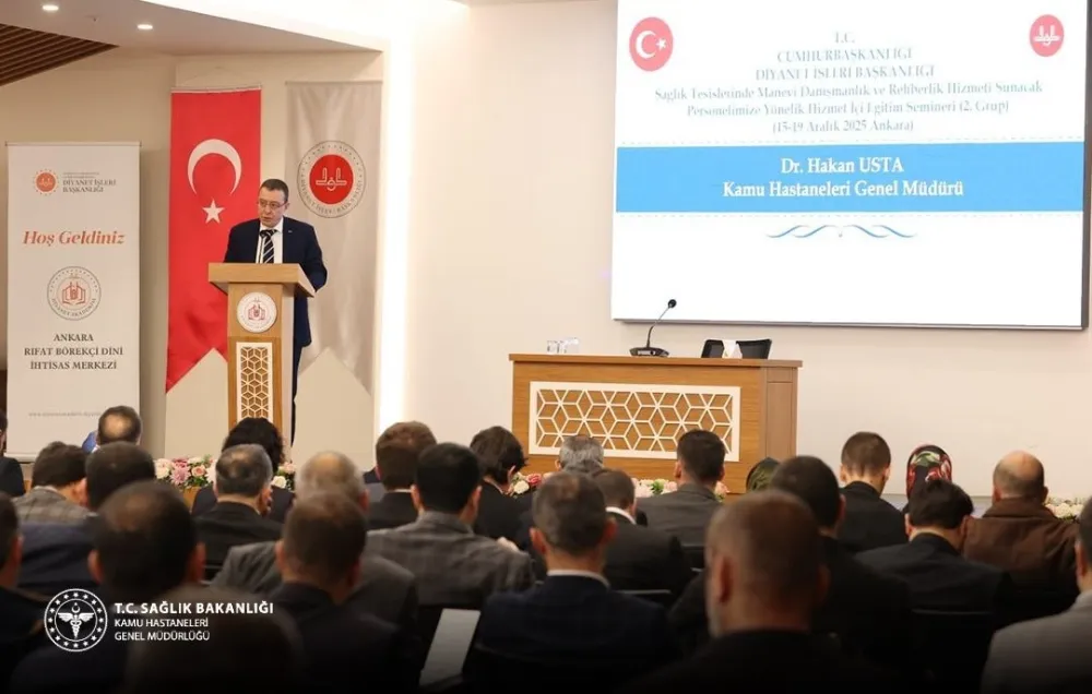 Sağlık Bakanlığı ile Diyanet İşleri Başkanlığı arasında imzalanan “Hastanelerde Manevi Destek Sunmaya Yönelik İş Birliği Protokolü” kapsamında, sağlık tesislerinde manevi danışmanlık ve rehberlik hizmeti sunacak personele yönelik Hizmet İçi Eğitim Semineri, 15 Aralık 2025 tarihinde Kocatepe Kültür Merkezi Rıfat Börekçi Eğitim Merkezi’nde düzenlendi.