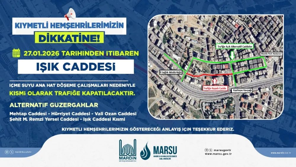 Mardin Büyükşehir Belediyesi Su ve Kanalizasyon İdaresi (MARSU) tarafından yürütülen “Mardin İçme Suyu Projesi” kapsamında Artuklu İlçesinde Işık Caddesi, trafik ve yaya güvenliğini sağlamak amacıyla kısmi olarak trafiğe kapatılacağı duyuruldu.