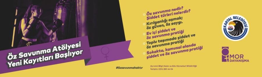 Kartal Belediyesi ve Mor Dayanışma işbirliğiyle başlatılan Öz Savunma Atölyesi çalışmalarına başvurular Kartal Belediyesi Kadın ve Aile Hizmetleri Müdürlüğü’ne yapılabilecek. Atölye çalışmaları kapsamında; Öz savunma nedir? Şiddet türleri nelerdir? Kırılganlığı aşmak; öz güven, öz saygı… Ev içi şiddet ve öz savunma pratiği. Toplu taşımada şiddet ve öz savunma pratiği. Sokakta, kamusal alanda şiddet ve öz savunma pratiği başlıklarını içeren eğitimler verilecek. Beş hafta sürecek eğitimlerde öz savunma stratejileri teorik ve pratik olarak öğretilecek. Eğitimlerin sonunda kadınlara katılım belgesi verilecek.