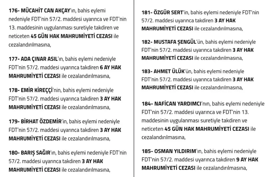 Profesyonel Futbol Disiplin Kurulu’nun 18.11.2025 tarih ve 28 sayılı toplantısında FDT’nin 57. maddesi uyarınca Kurulumuza sevk edilen 2. Lig sporcuları hakkındaki almış olduğu kararlar aşağıda belirtilmiştir.