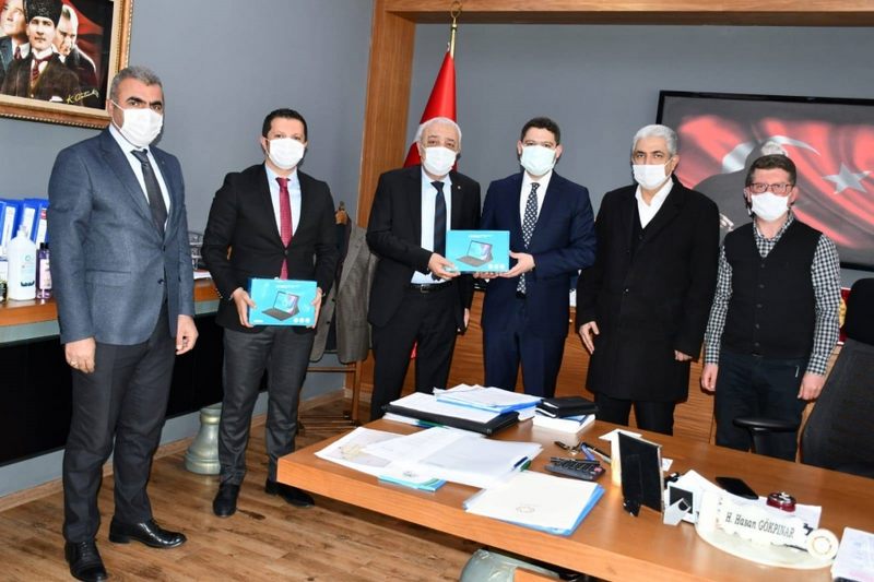 Mardin Ticaret ve Sanayi Odası Yönetim Kurulu Başkanı Mehmet Ali TUTAŞI ,Yönetim Kurulu Başkan Yardımcısı Mahmut BİLBEN ve Genel Sekreter Çetin SASA tarafından ,Artuklu Kaymakamı Hacı Hasan GÖKPINAR ve Artuklu İlçe Milli Eğitim Müdürü Mehmet Emin DUYAN’a öğrencilere dağıtılmak üzere 55 adet Eba uyumlu Tablet teslim edildi.