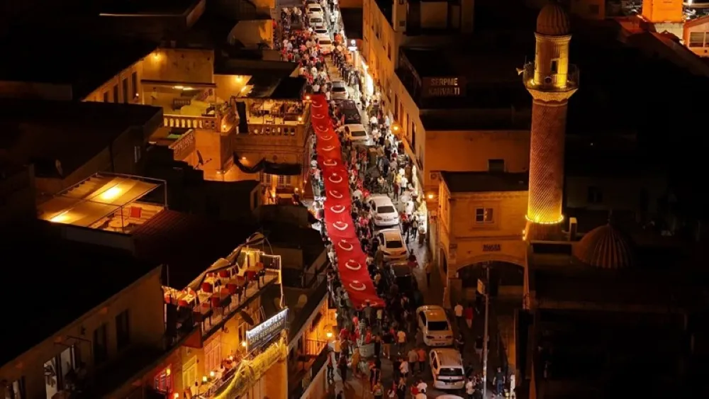 Mardin'de, 30 Ağustos Zafer Bayramı'nın 102'nci yıl dönümü dolayısıyla düzenlenen Fener Alayı Korteji'nde 47 metre uzunluğunda ay yıldızlı bayrağımız taşındı.