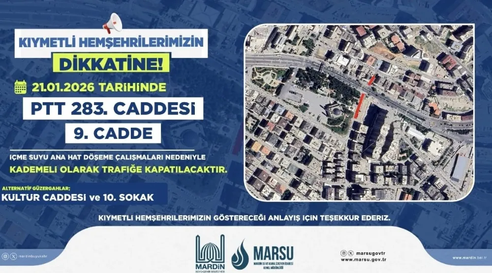 Mardin Büyükşehir Belediyesi Su ve Kanalizasyon İdaresi (MARSU), yürütülen “Mardin İçme Suyu Projesi” kapsamında yapılacak yatay geçiş ana hat döşeme çalışmaları nedeniyle PTT 283. Cadde ile 9. Cadde’nin kademeli olarak trafiğe kapatılacağını duyurdu.