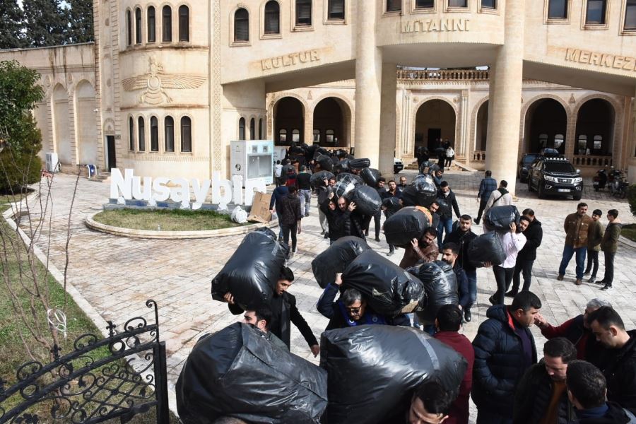 Deprem sonrası Nusaybin Kaymakamlığı ve Nusaybin Belediye Başkanlığı tarafından Mitanni Kültür Merkezinde kurulan Afet Koordinasyon Merkezinde yardım malzemeleri toplandı.