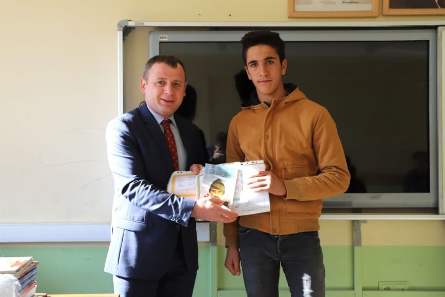 Mazıdağı Mesleki ve Teknik Anadolu Lisesinde öğrencilere karnelerini dağıtan Kaymakam Mustafa Görmüş, öğrenciler ile sohbet ederek karnesi beklendiği gibi olmayan öğrencilere morallerini bozmamaları tavsiyesinde bulundu, başarılı öğrencileri de tebrik etti.