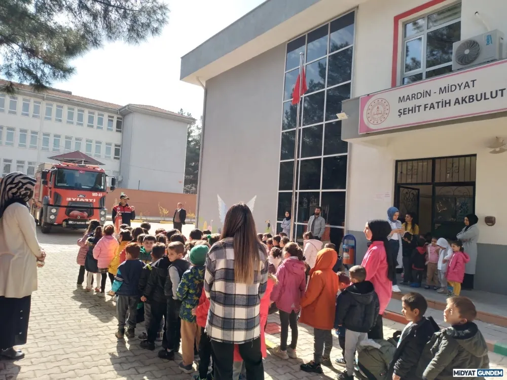 Midyat Şehit Fatih Akbulut Anaokulu öğrencilerine verilen uygulamalı eğitimde, acil durum 112 ihbar numarası, itfaiye olayları, yangın, deprem anında neler yapacakları öğretildi.