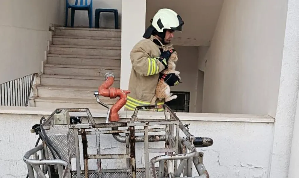 Mardin Büyükşehir Belediyesi itfaiye ekipleri, Nusaybin ilçesi Devrim mahallesinde lisede mahsur kalan kediyi kurtardı