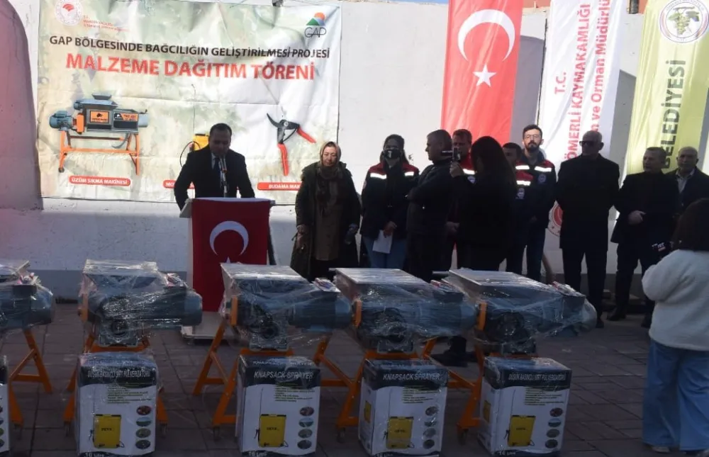 Mardin'in Ömerli ilçesinde İl Tarım ve Orman Müdürlüğünce uygulanan ve GAP-BKİ destekli GAP bölgesinde bağcılığın geliştirilmesi projesi kapsamında düzenlenen programla 56 çiftçiye üzüm sıkma makinesi ve müştemilatı dağıtıldı.