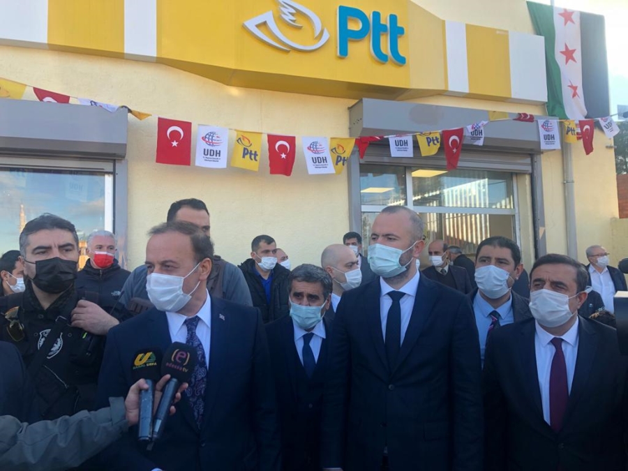 Suriye’nin kuzeyinde kurulan PTT iş yeri, Şanlıurfa Valisi Abdullah Erin ve PTT AŞ Genel Müdürü Hakan Gülten’in katılımıyla gerçekleşen açılış töreni ile hizmet vermeye başladı. Barış Pınarı Harekâtı ile terör örgütlerinden temizlenen Suriye'nin Tel Abyad ilçesinde iş yeri açtıkları için gurur duyduklarını ifade eden Hakan Gülten, “Daha önce mobil araçlarla hizmet verdiğimiz Tel Abyad’da, sunduğumuz hizmetlerin herkes için ulaşılabilir olması amacıyla, bölgedeki iş yerlerimize bir yenisini daha eklemenin mutluluğunu yaşıyoruz” dedi.