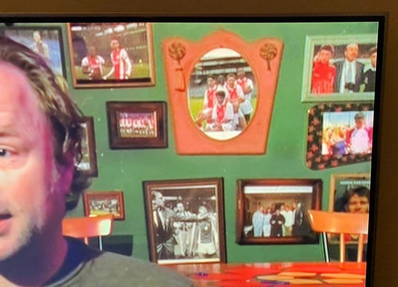 Görüntü bir kahvehaneden. Haber Korona virüs hakkında. Kahvehane sahibi bir Ajax sevdalısı.